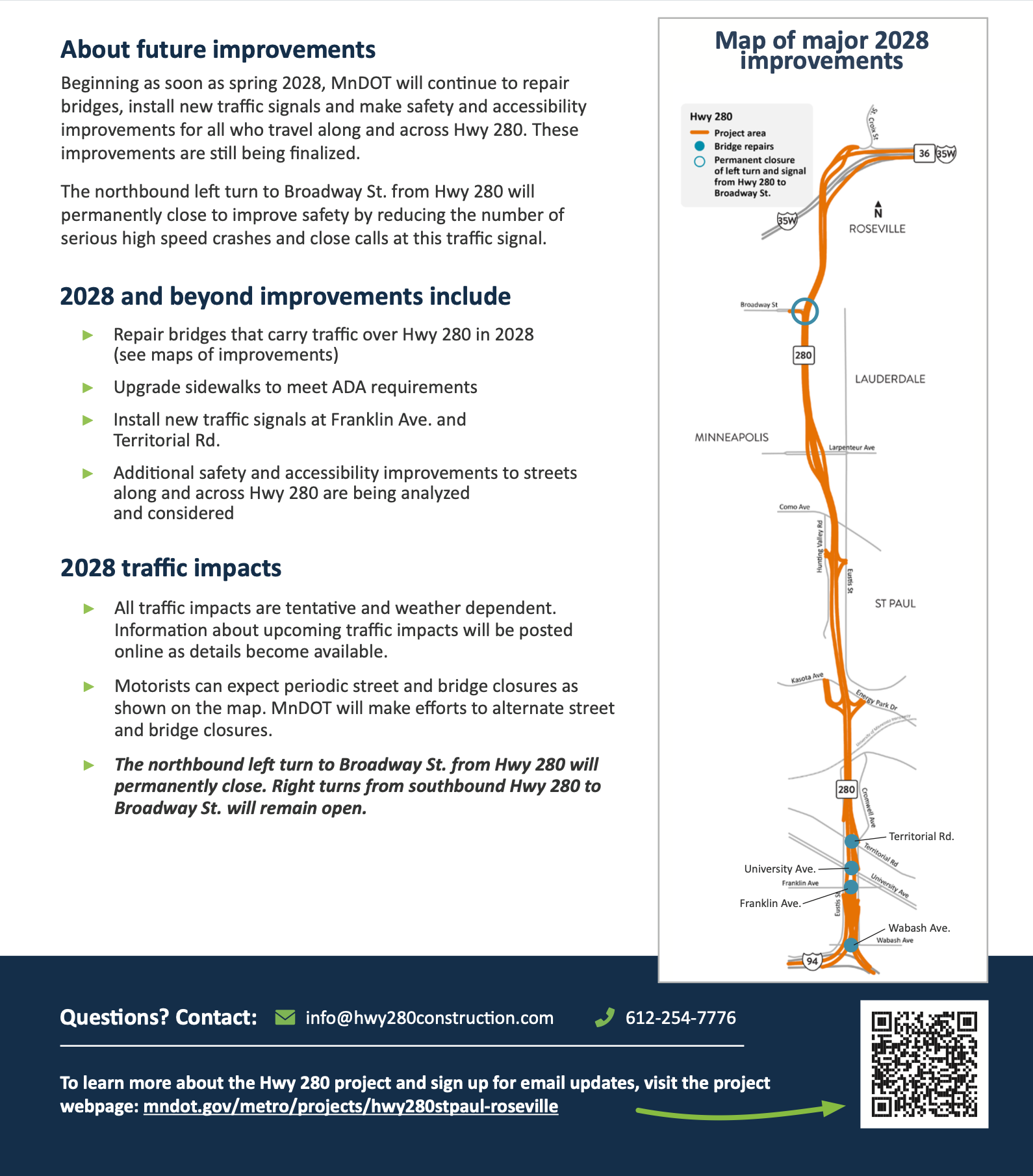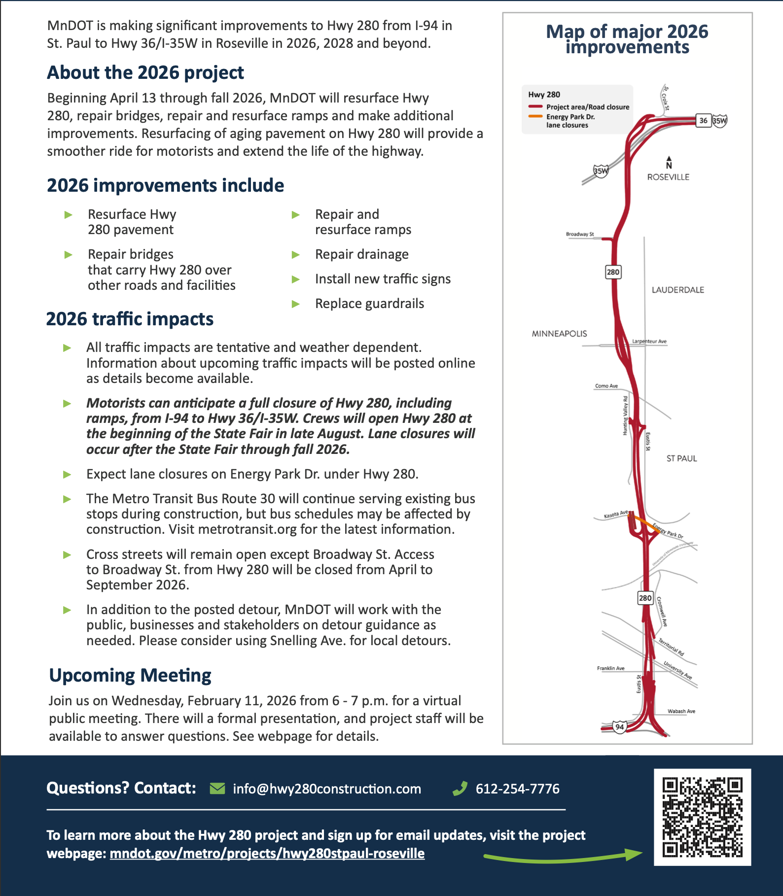 Join MnDOT for a virtual meeting on Wednesday, February 11 from 6 p.m. to 7 p.m. to learn more about the 2026 and 2028 construction projects for Hwy 280. The virtual meeting will include a presentation and time for questions and answers. A recording of the virtual meeting will be available on the project webpage a few days after the meeting.