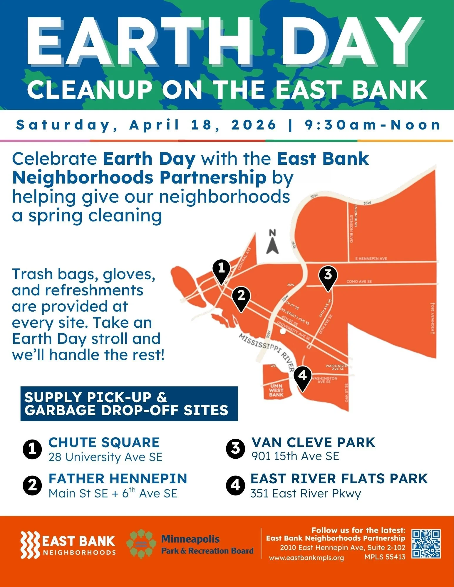 Meeting Location: Meet at the corner of 3rd Ave SE and Main St SE, across from the Pillsbury A-Mill. From there, walk down the stairs across from the mill, and you’ll find the sign-in area in the clearing below Main Street SE, near the Third Ave SE road leading to the University of Minnesota lab. Upon arrival, you’ll sign in, learn about the area and activities, meet other volunteers, and receive tools and supplies for the event.