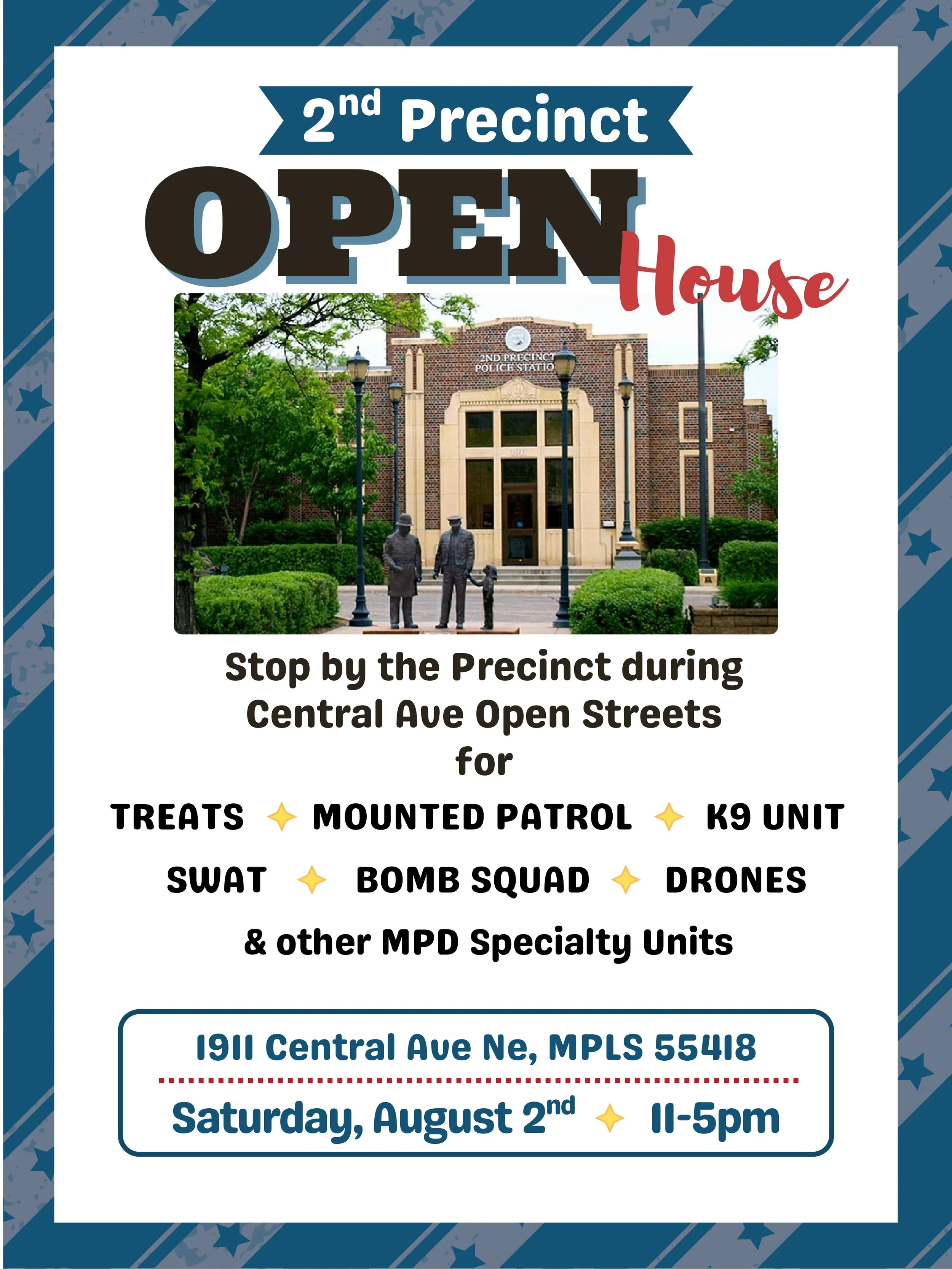 MPD 2nd Precinct Open House Saturday, August 2, 2025 11:00 AM 5:00 PM 1911 Central Avenue Northeast Minneapolis, MN, 55418 United States (map) Google Calendar ICS