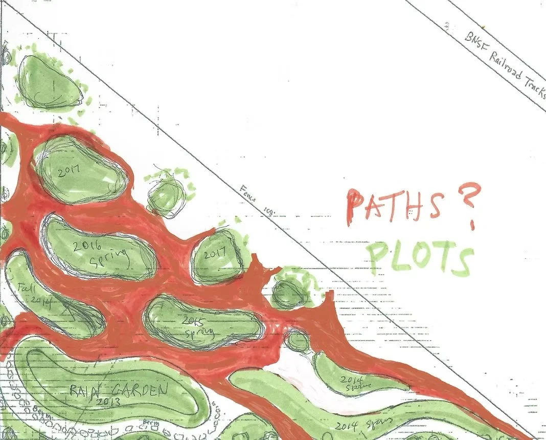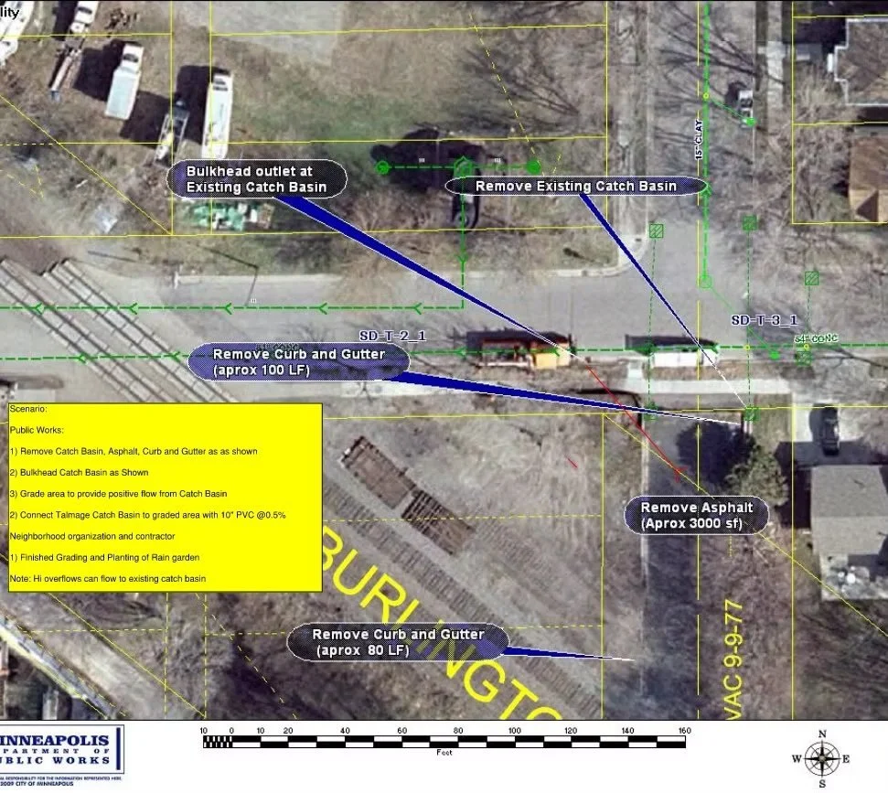 In 2010, a Minneapolis Public Works Sewer Technician met with neighborhood members on-site, proposing the removal of asphalt and the redirection of street drainage into a rain garden. However, it was discovered that part of the vacated right-of-way (ROW) was privately owned and would need to be acquired before the project could move forward.