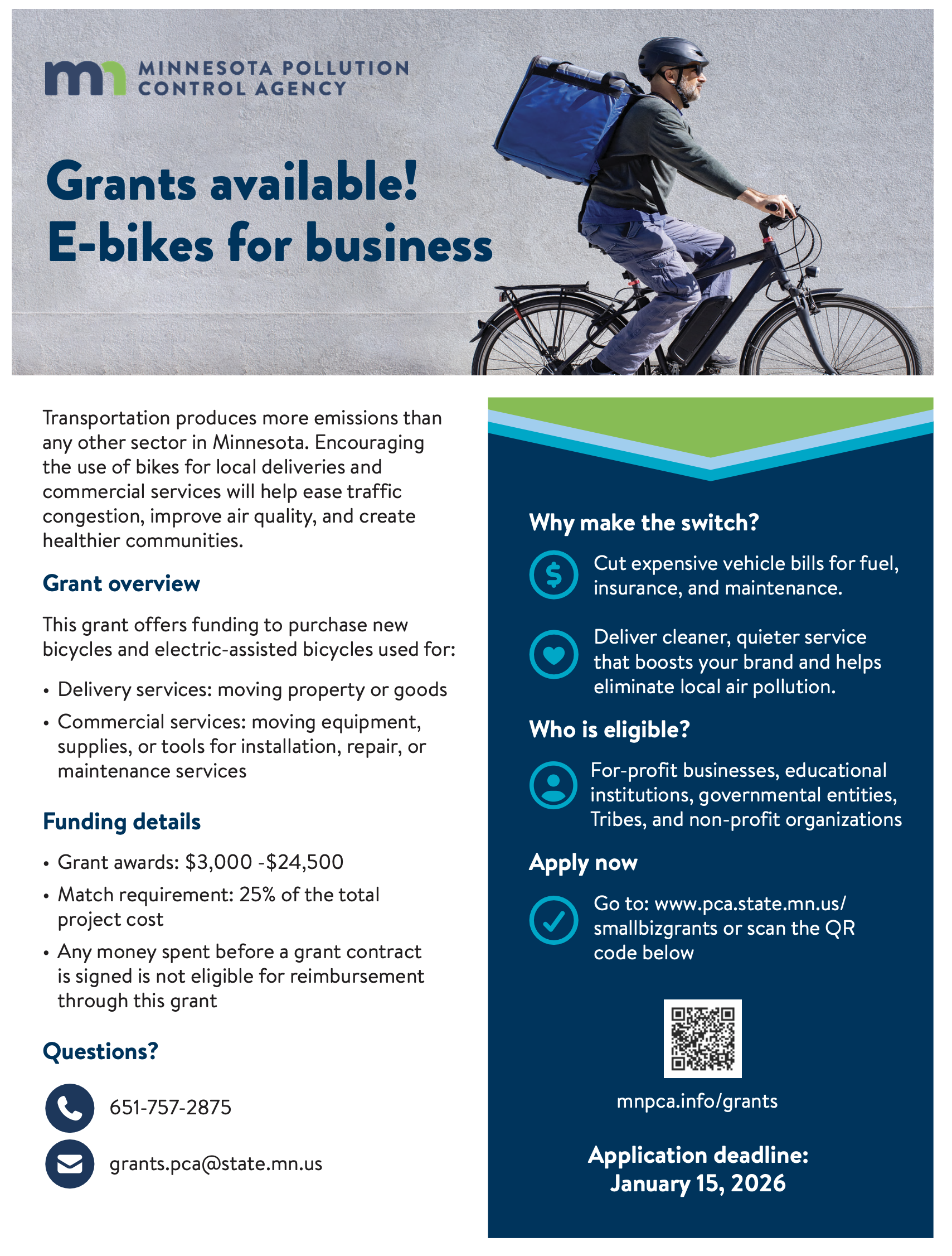 Minnesota businesses and organizations can receive a grant to purchase bicycles and electric-assisted bicycles (e-bikes) for commercial use through the Minnesota Pollution Control Agency's (MPCA) Small Business Environmental Assistance Program!